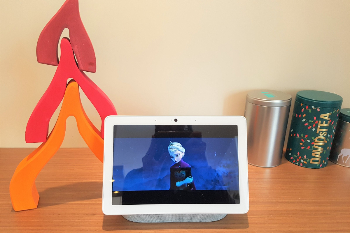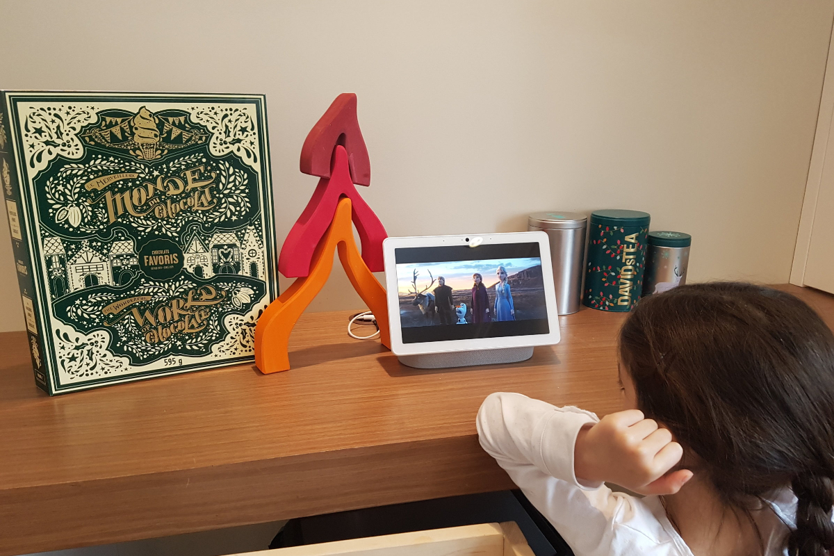 Néanmoins, interagir seulement avec la voix, ce n’est pas toujours optimal. Je vous disais que mon amoureux voyage passablement souvent pour le travail et Google Duo est notre façon de rester en contact (des appels vidéo). Ça fonctionne très facilement et très naturellement, mais jusqu’à maintenant, on le faisait avec le téléphone. Du côté du voyageur, aucun problème. Très pratique d’ailleurs pour le faire dans les gares, les aéroports… Par contre, du côté des petits, c’est un peu plus difficile. Le champs de vu de la caméra du téléphone se prête moins bien à une conversation à plusieurs, le son en main libre n’est pas toujours super et, le plus important, ce n’est pas simple de décider qui va tenir le téléphone !! Il y a des chicanes qui éclate . “C’est moi qui veut parler à papa!” “Non, c’est moi!” Et j’ai beau vouloir tenir moi-même le téléphone, l’émotivité prend souvent le dessus, surtout quand les enfants s’ennuient de papa…