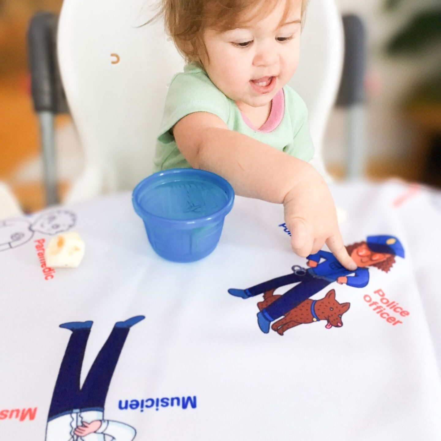 Il s’agit de nappes merveilleusement jolies avec plein de petits dessins rigolos dessus (faits par des illustrateurs québécois)! Il y a aussi des mots-étiquettes en français et en anglais (wow!) et, le plus chouette dans toute cette histoire, c’est que l’on peut écrire dessus avec des crayons de couleur lavables!